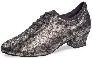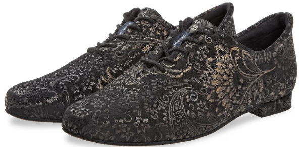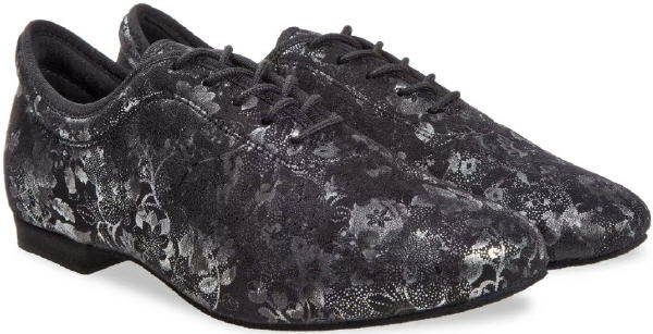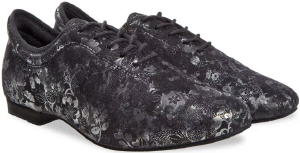 Ein sehr leichter Tanzschuh in modernem Turnschuhdesign. Der geschlossene Schnürschuh wird mit einer 5-Loch Schnürung und mit weicher Schaftrandpolsterung gefertigt. Material: Velourleder / Glitter Sohle: Rauleder Absatz: 1.2 cm Block Farbe: schwarz Grössen: EU 33.5 - 44 (auch in 1/2 Gr.) Weite: F (Mittlere Weite) runde Form Preis: CHF 130.- |