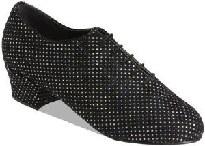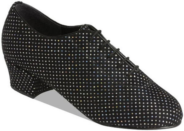 Ein sehr leichter Tanzschuh in modernem Turnschuhdesign. Der geschlossene Schnürschuh wird mit einer 5-Loch Schnürung und mit weicher Schaftrandpolsterung gefertigt. Material: Velourleder / Glitter Sohle: Rauleder Absatz: 1.2 cm Block Farbe: schwarz Grössen: EU 33.5 - 44 (auch in 1/2 Gr.) Weite: F (Mittlere Weite) runde Form Preis: CHF 120.- |